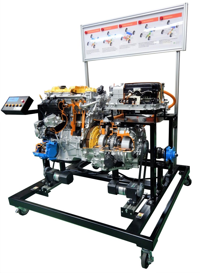 トヨタプリウスに搭載されているエンジン、動力分割機構、モータ、インバータなどを内部構造が観察できるようにカット加工、色分け塗装され、キャスター付スチール架台に設置されたハイブリットシステム説明用の実物モデルです。