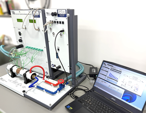 | 隣接する流体と固体間の熱エネルギーを伝える現象(熱交換)を実演し、流量や温度差による影響を検証する卓上型実験装置で、装置手前に5種類の熱交換器(別売)いずれかを取付けて各種熱交換器の性能、熱伝達率等を比較実験します。私立大学様へ設置されました。 |